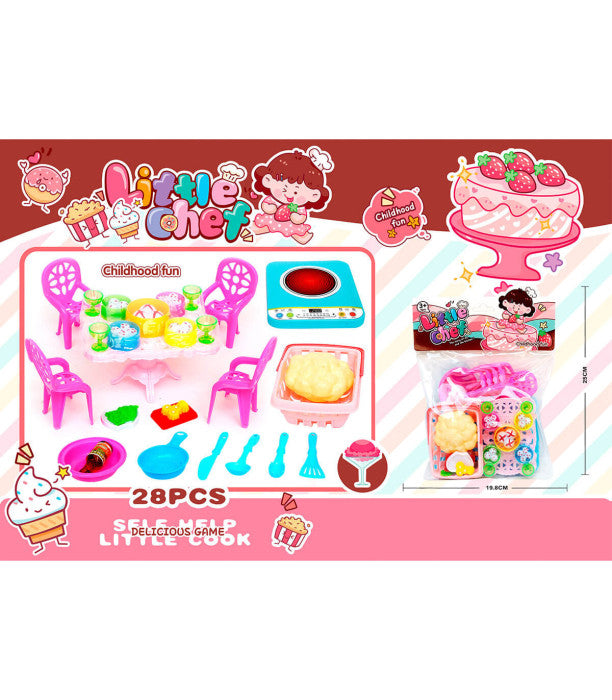 Кукленски сет от пластмасова масичка с 4 стола, чаши, блюда с ястия и хранителни продукти, котлон, прибори и какво ли още не! Комплектът идва в ярки неонови цветове, които обезателно ще привлекат вниманието на всяка малка фея и ще направят играта още по-забавна и вдъхновяваща!