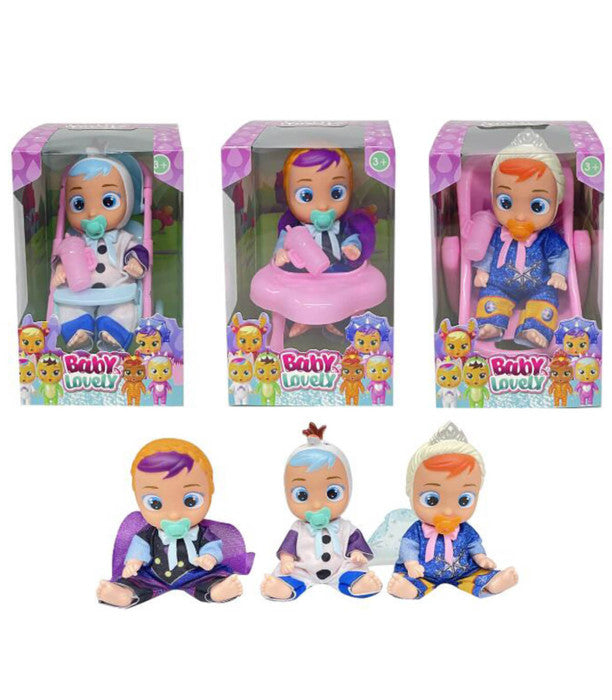 Малко пластмасово бебе с гумена глава и подвижни крайници, дегизирано като сладко животинче. То идва в комплект с биберон, шише за водичка или мляко, и количка/проходилка/столче, за да станат игрите още по-забавни и вълнуващи!