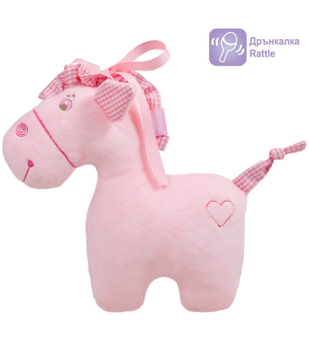 Розово плюшено конче-дрънкалка, което няма да остане незабелязано от нито едно мъниче. Кончето има симпатична панделка на главата си, но тя има и друга функция, освен да прави играчката още по-интересна – с нея можете да завържете дрънкалката на количката, креватчето или където пожелаете.